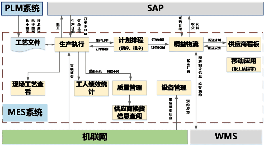 MES系统实现了生产计划管理,生产实绩采集,设备管理、刀具管理、质量管理、厂内物流配送等。