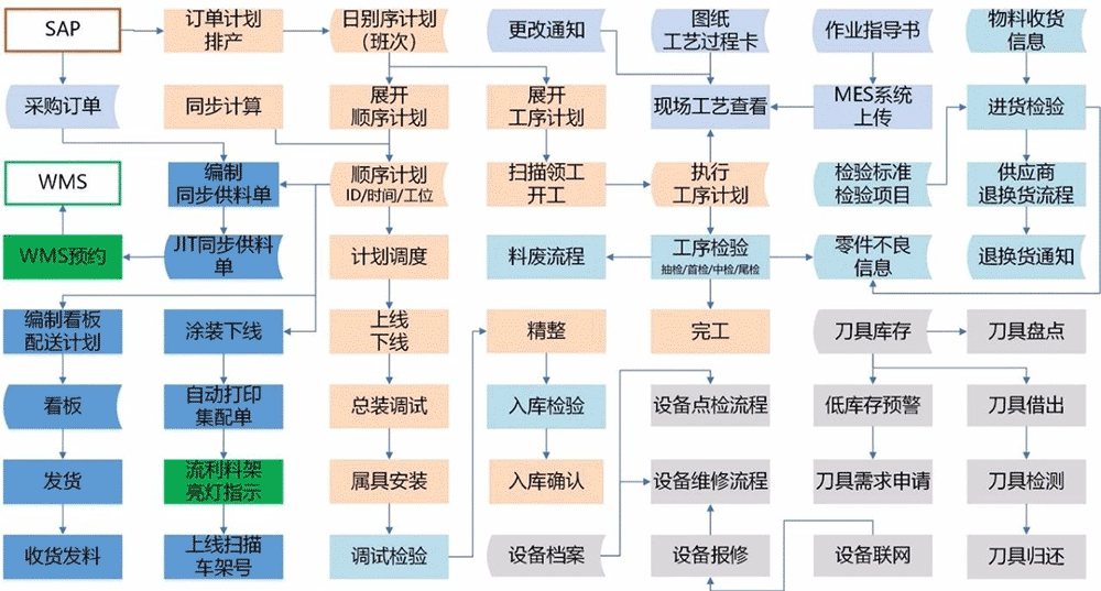 MES系统实现了生产计划管理,生产实绩采集,设备管理、刀具管理、质量管理、厂内物流配送等。