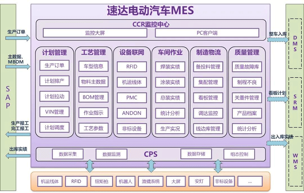 MES系统覆盖实施速达电动汽车1条焊装线、1条涂装线、1条总装线、1个中心仓库、1个冲焊仓库和总装分拣集配区。