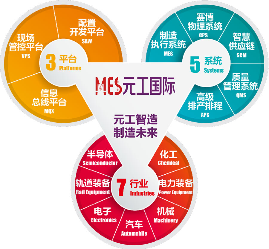 基于前期十几年的积累,元工国际已经构建了一个成熟完整的MOM体系,其自主研发的软件,在整个工业软件的排行榜上也已经崭露头角,形成了“三大平台”、“五大产品”、“七大行业”的结构布局。