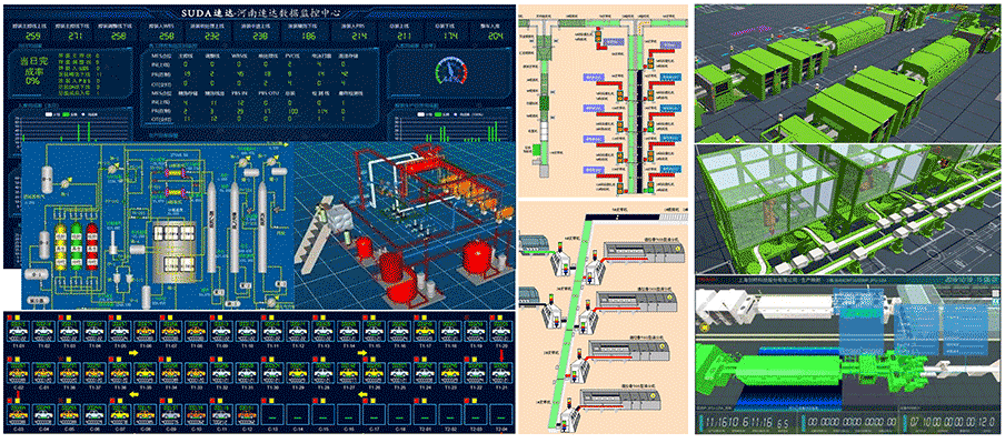 综合组态图,除了显示PLC/DCS和仪表/传感器的动态外,可显示数控(CNC)、机器人和工控机系统的动态,还可显示按灯/呼叫、自动立库和AGV等的动态,以及设备故障、SPC/SPD告警预警等。