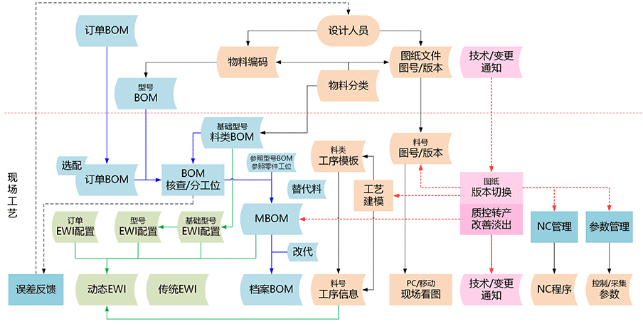 - 技术/变更通知驱动工程变更,包括图纸版本启用、转产(质控转产和改善转产)和NC/参数版本切换等。