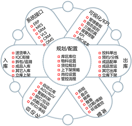 - 采用先进的物流技术和信息技术,与自动立库、AGV/RGV、智能料架、RFID等智能设备集成,实现仓库自动作业。
